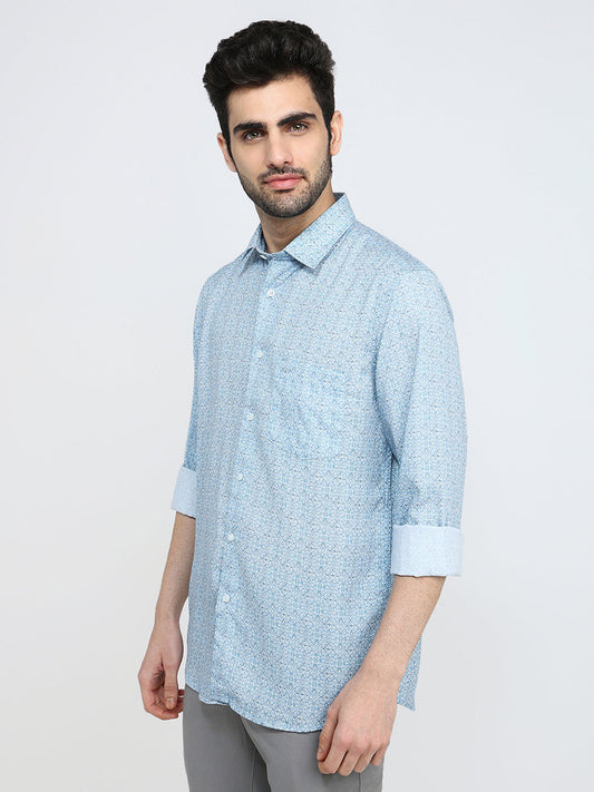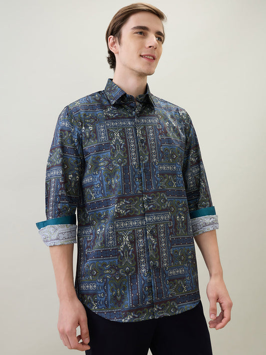 Colorplus Men Blue Printed Slim Fit Cotton Blend Full Sleeve Casual Shirt