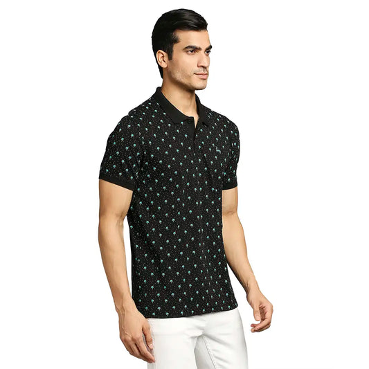 Men Black Regular Fit Print Cotton Round Neck Collar Polo T-Shirt