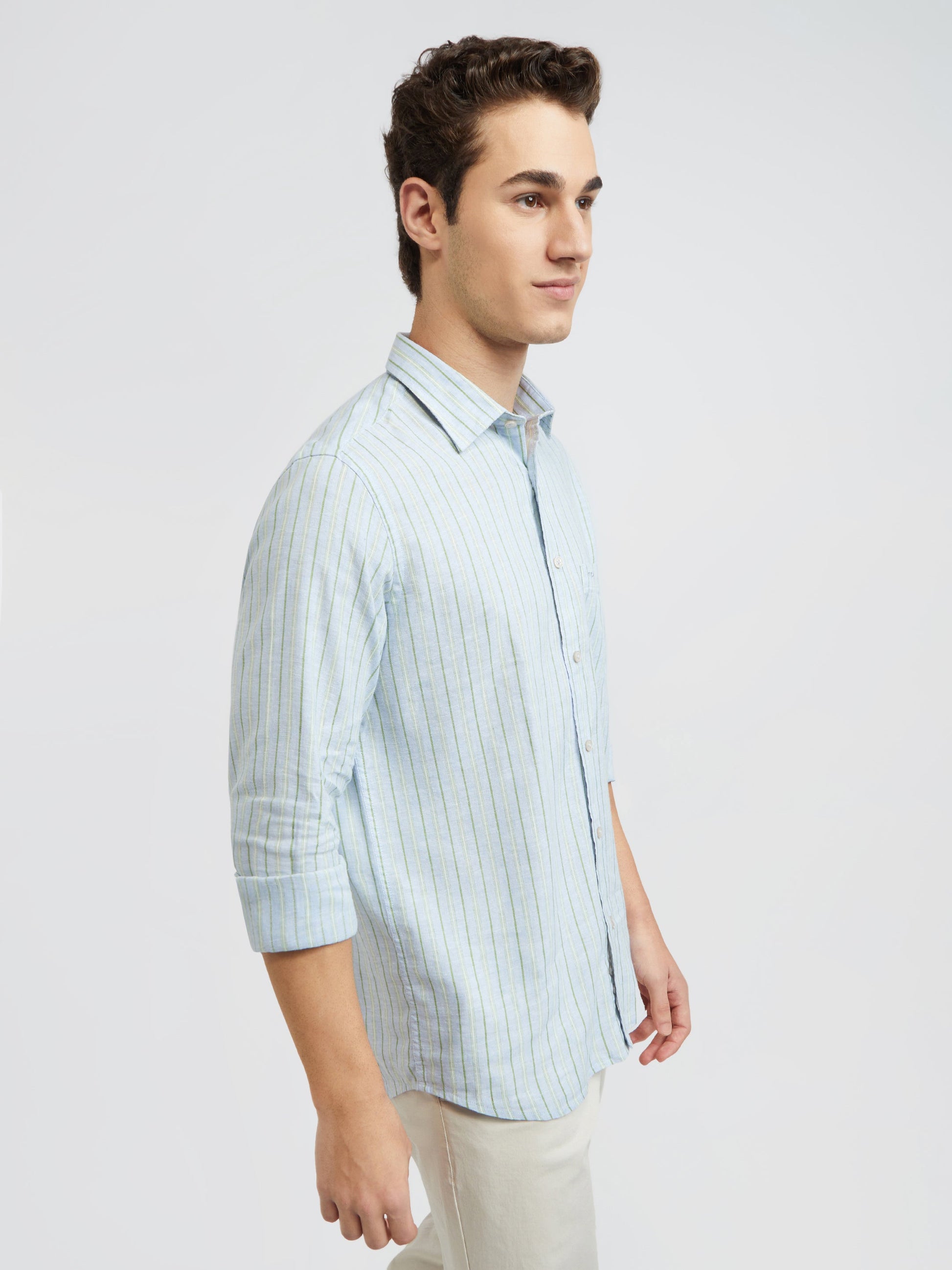 Men Blue Stripe Tailored Fit Linen Blend Full Sleeves Casual Shirt