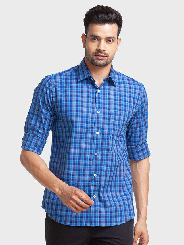 Colorplus Men Blue Checkered Tailored Fit Full Sleeve Spread Collar Shirt