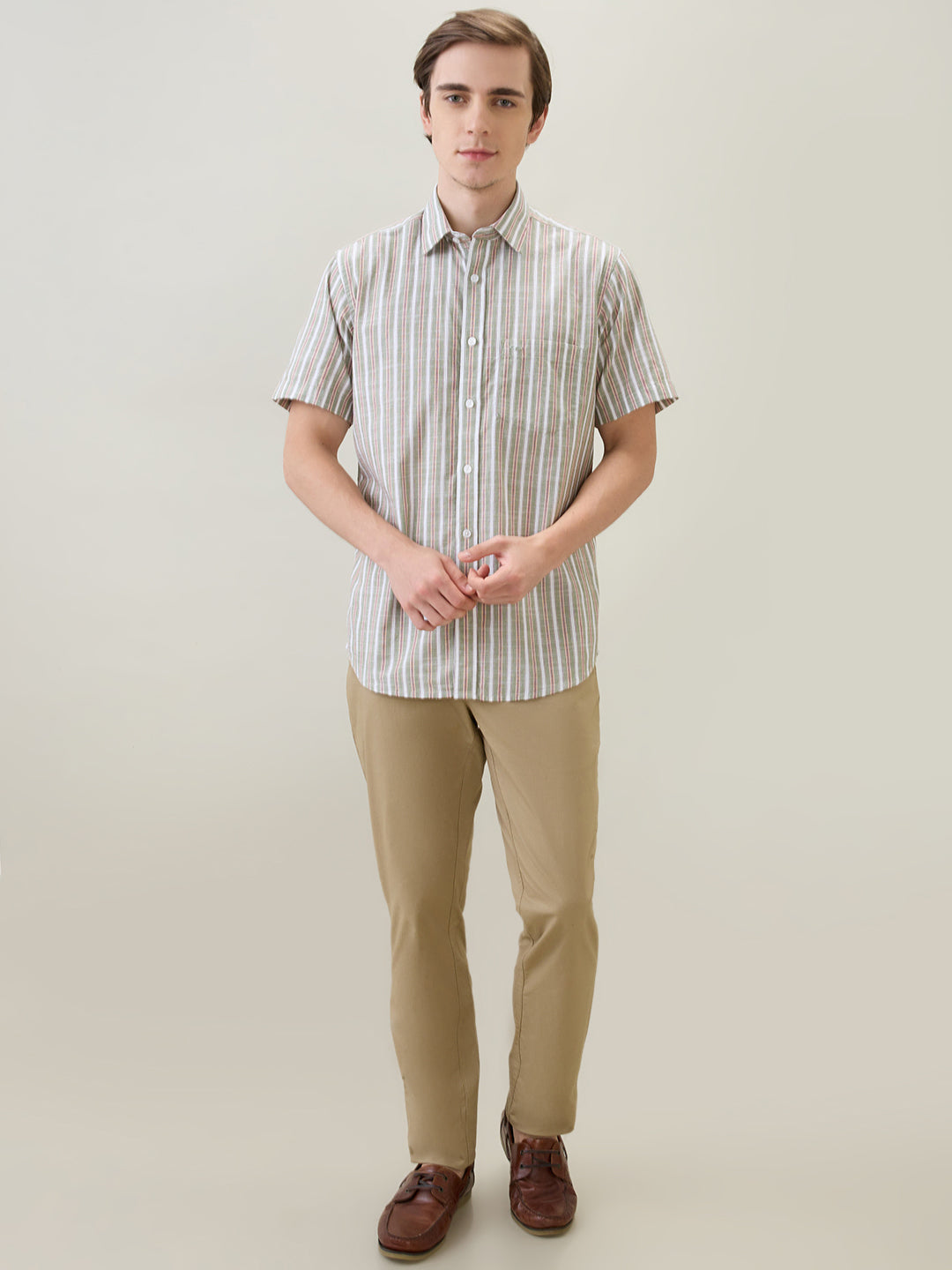 Colorplus Men Green Stripe Regular Fit Cotton Half Sleeve Casual Shirt