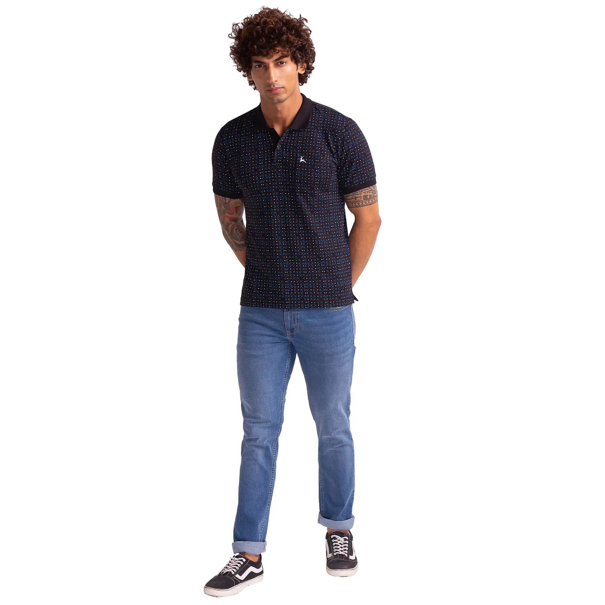Men Black Regular Fit Print Polyester Blend Round Neck Collar Polo T-Shirt