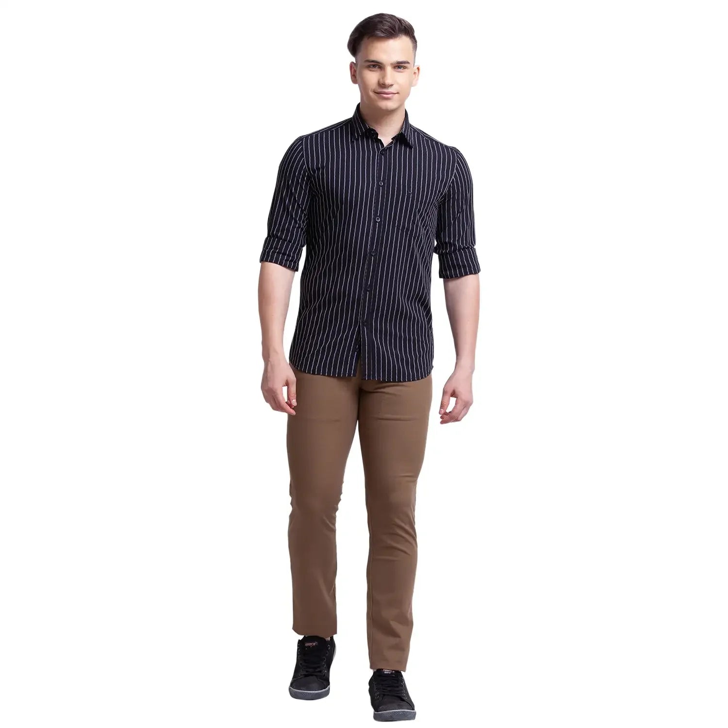 Men Black Slim Fit Stripe Polyester Blend Full Sleeve Shirts
