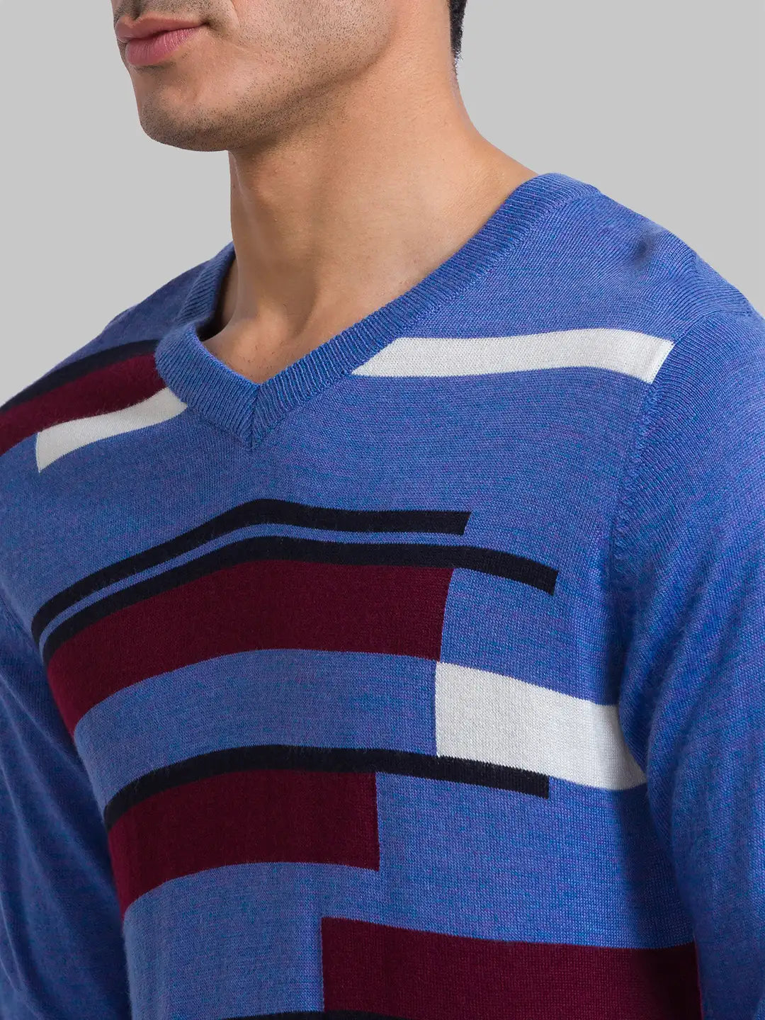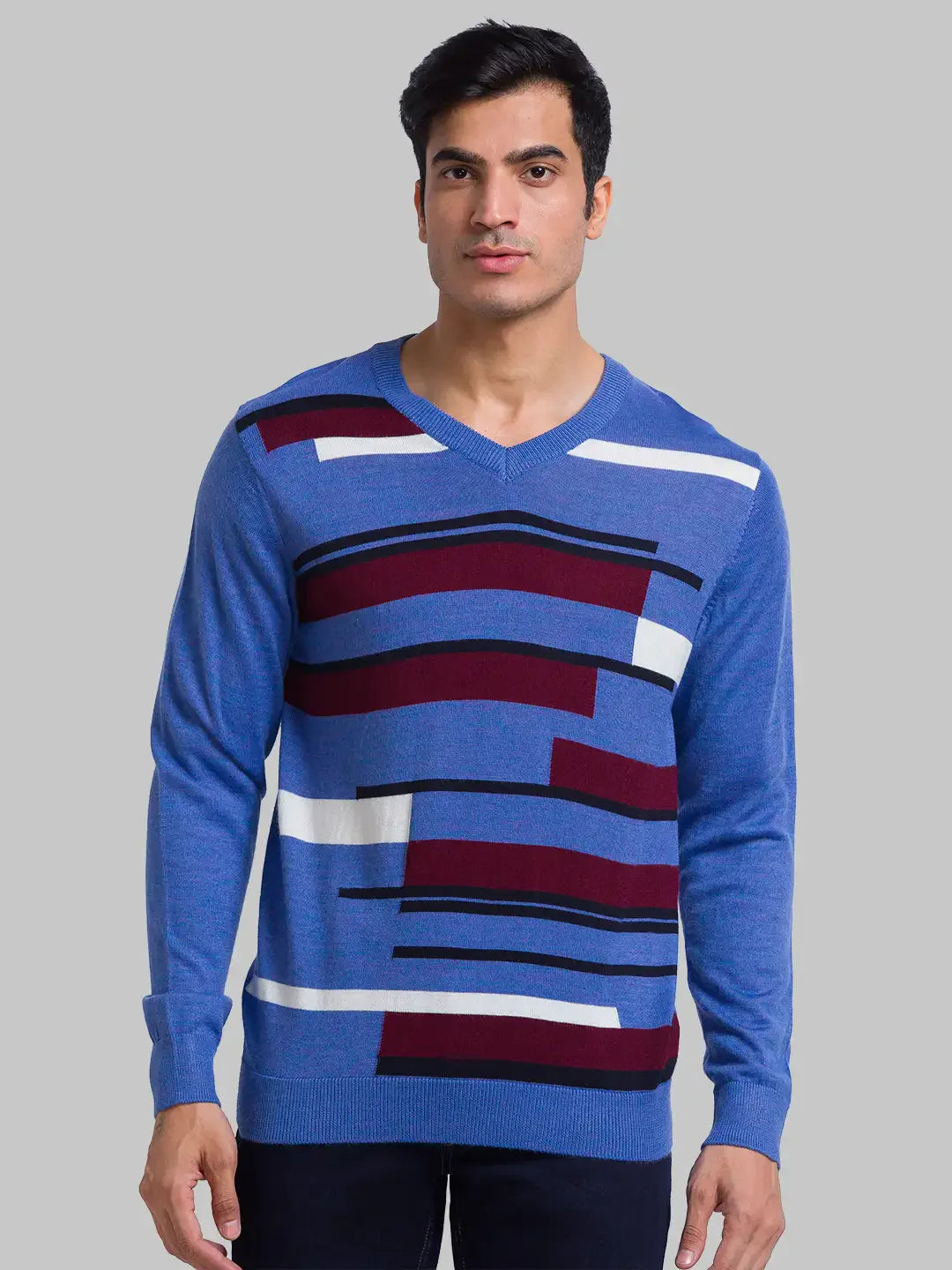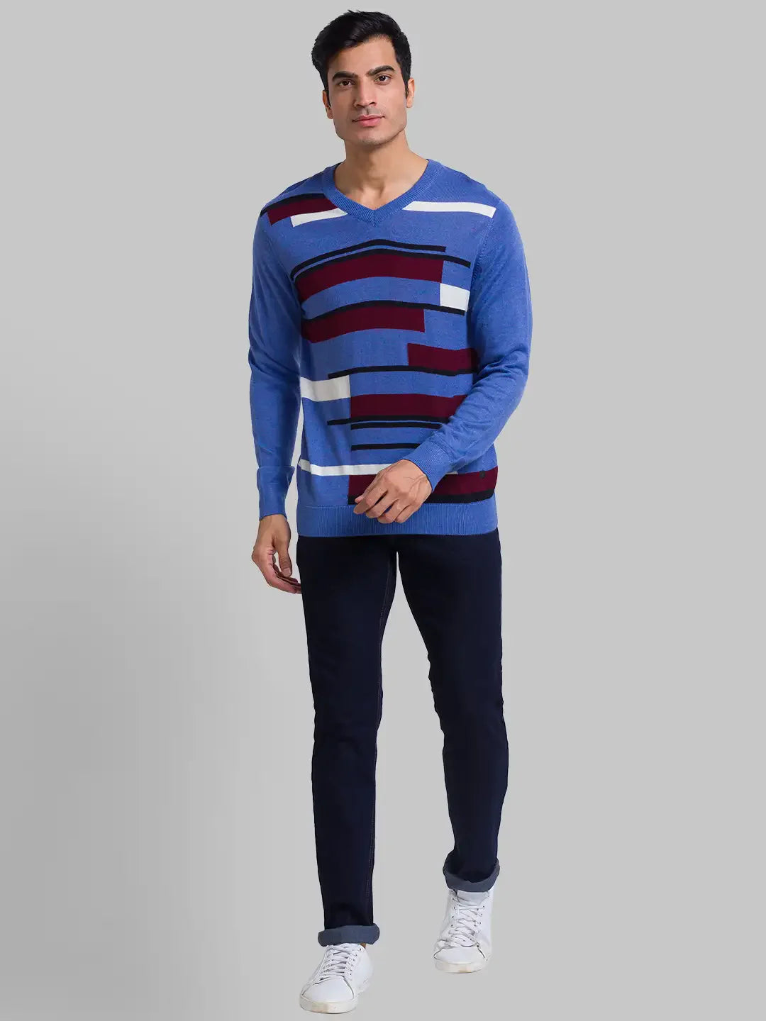 Men Blue Intarsia Acrylic Blend Full Sleeve Sweaters