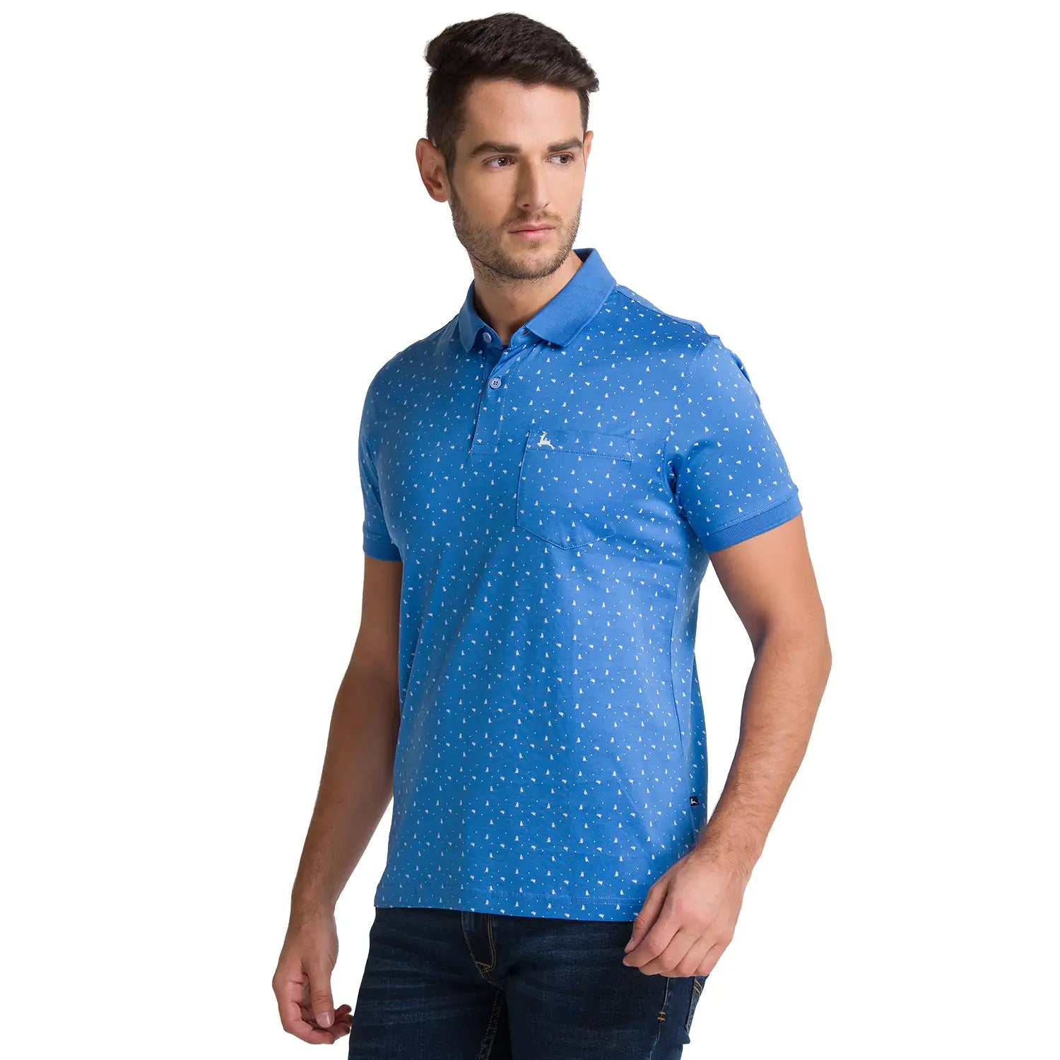 Men Blue Regular Fit Print Cotton Round Neck Collar Polo T-Shirt