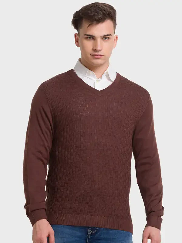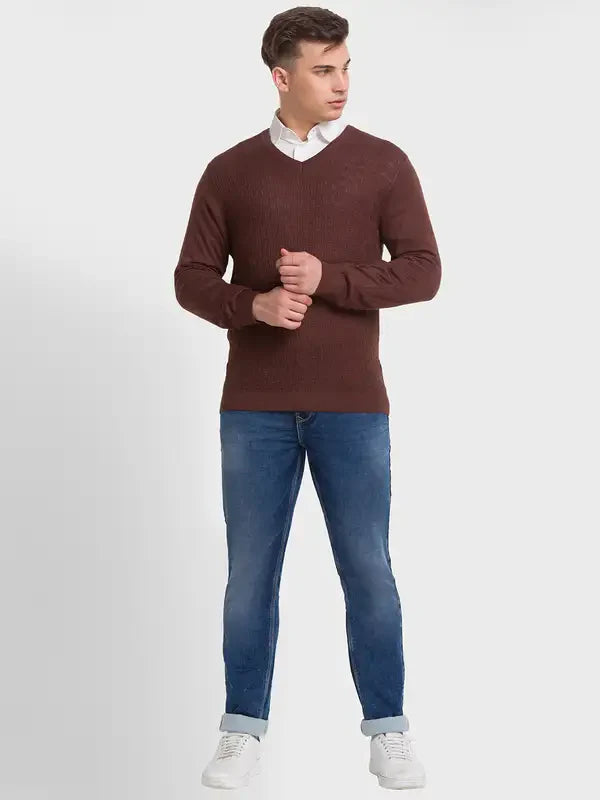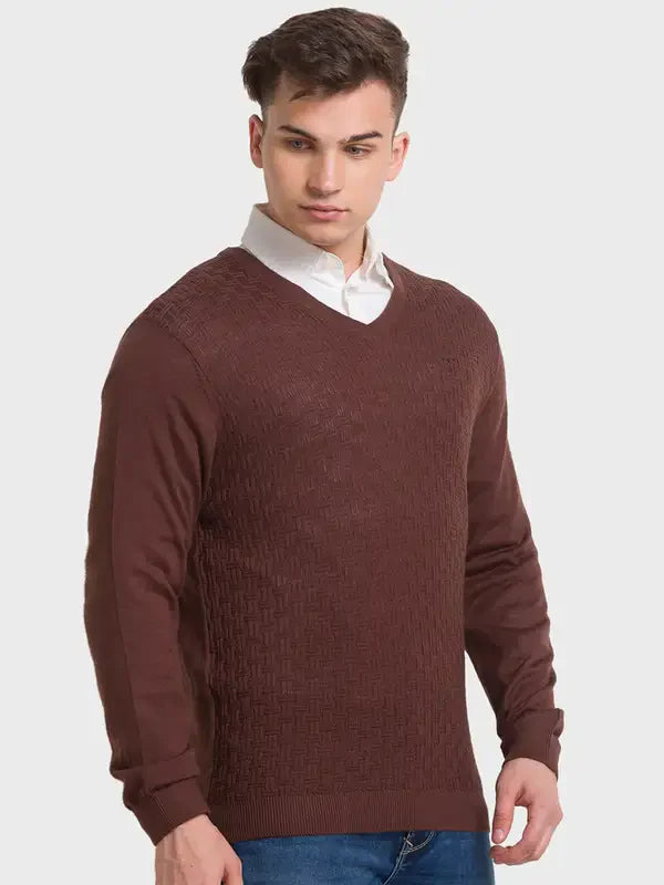 Men Brown Tailored Fit Structure Acrylic Merino Blend Full Sleeve V Neck Collar Sweaters