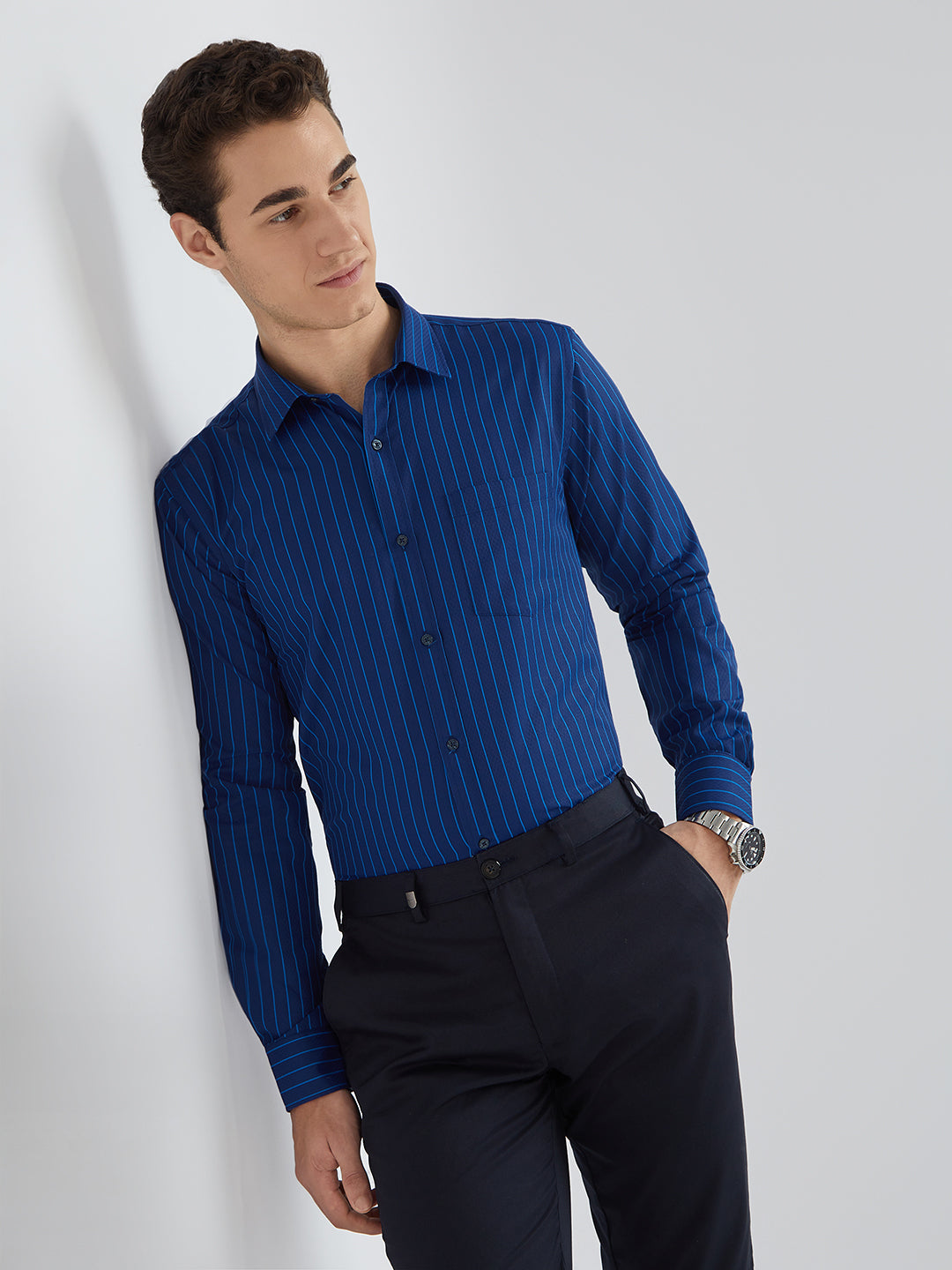 Men Blue Stripe Slim Fit Cotton Blend Formal Shirt