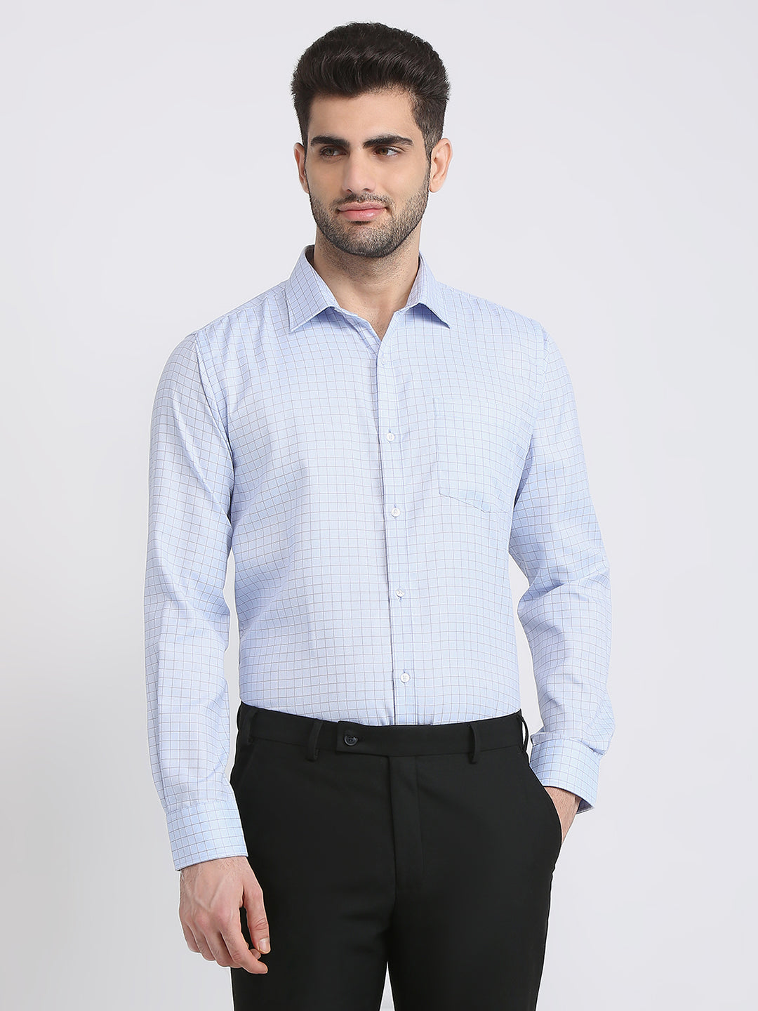 Men Blue Checks Slim Fit Cotton Blend Formal Shirt