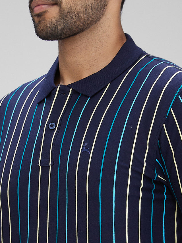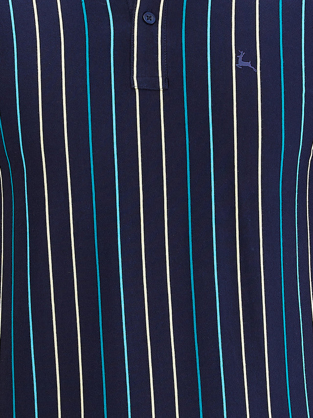 Men Blue Yarn Dyed Regular Fit Cotton Polo Neck T-Shirt