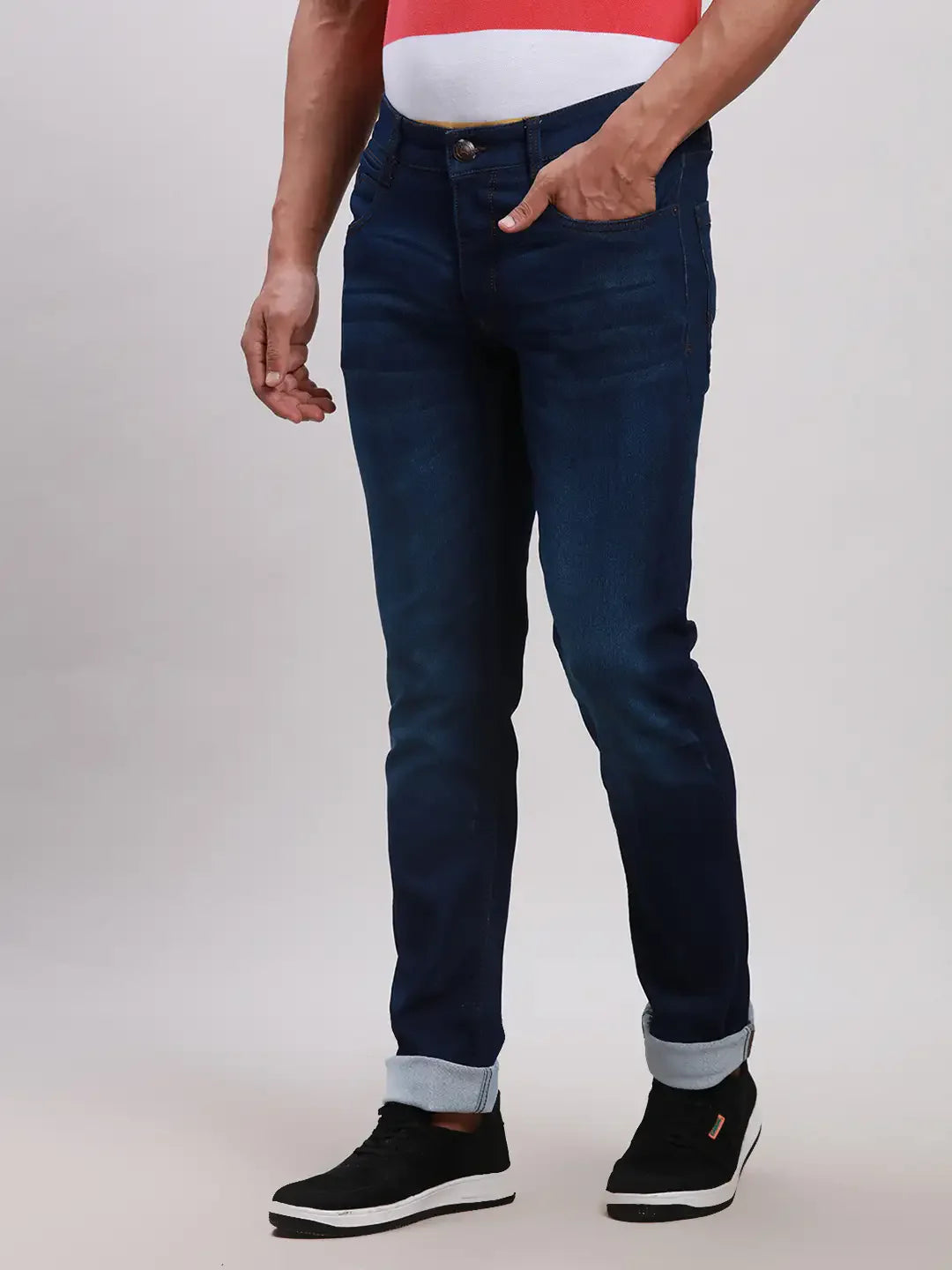Men Blue Plain Slim Tapered Fit Cotton Blend Jeans