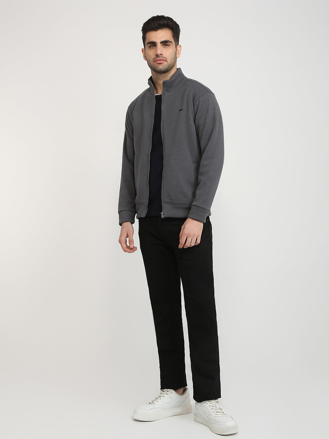 Men Grey Solid Regular Fit Polyester Blend Full Sleeve High Neck Collar Sweatshirt