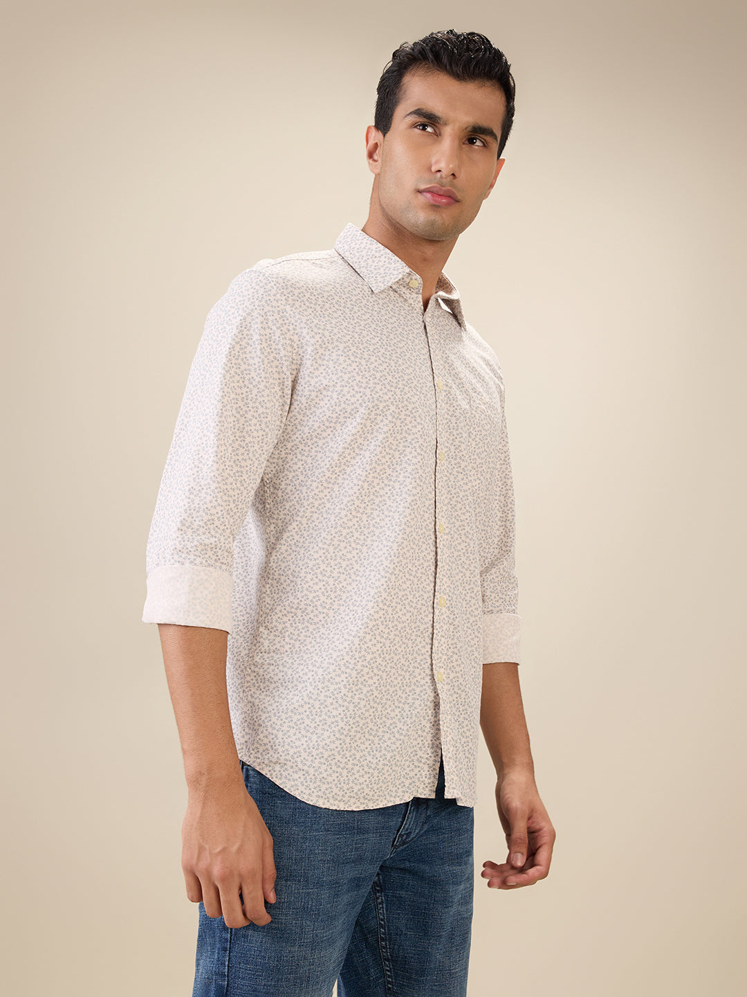 Men Orange Printed Slim Fit Cotton Full Sleeve Cut Away Collar Shirt
