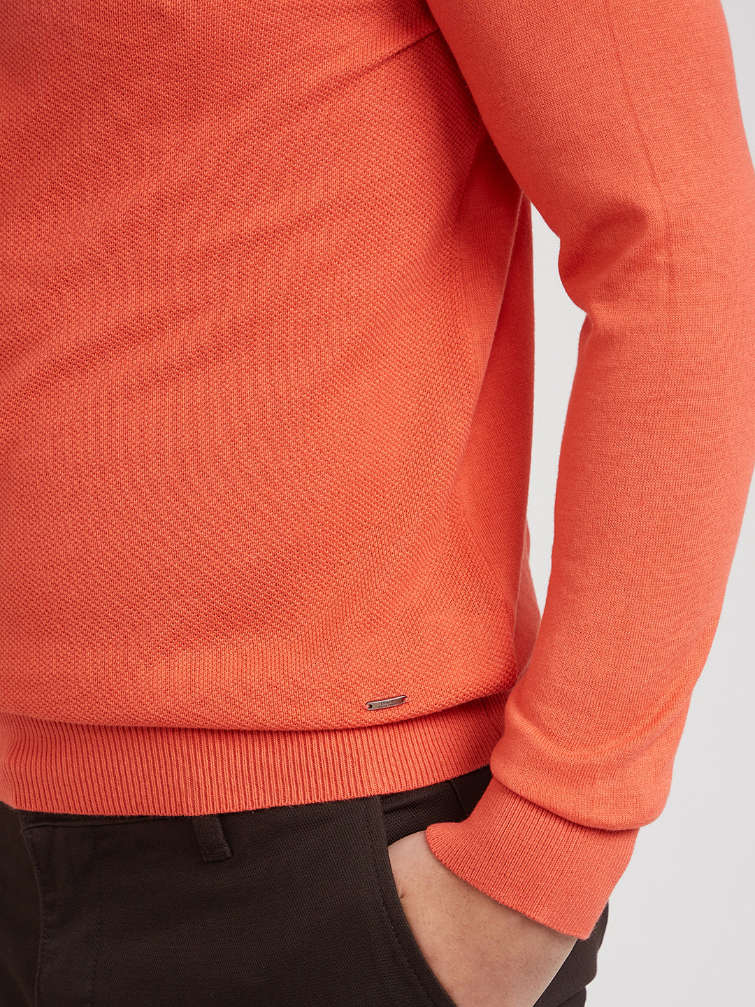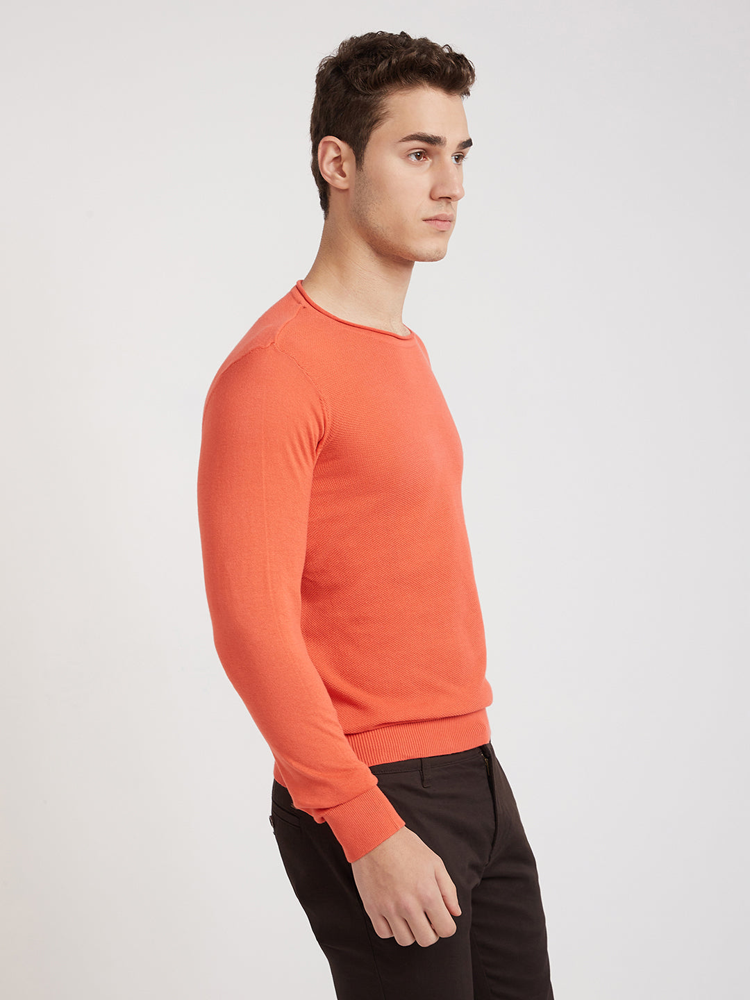 Men Orange Structure Cotton Full Sleeve Round Neck Collar Sweater