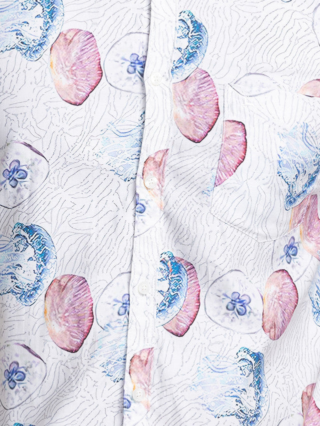 Men White Print Slim Fit Cotton Blend Full Sleeves Semicutaway Collar Casual Shirt
