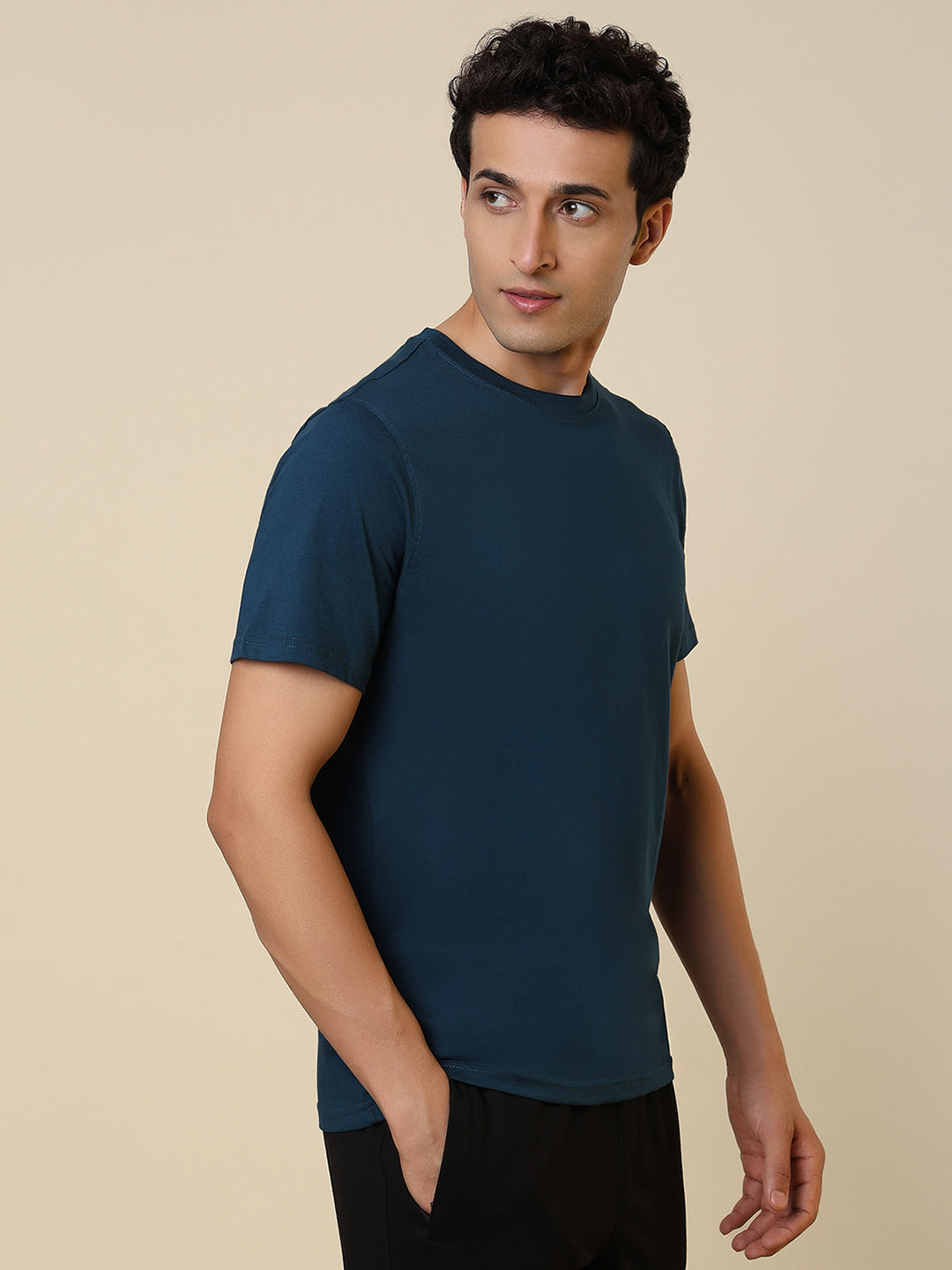 Men Blue Solid Regular Fit Cotton T-Shirt